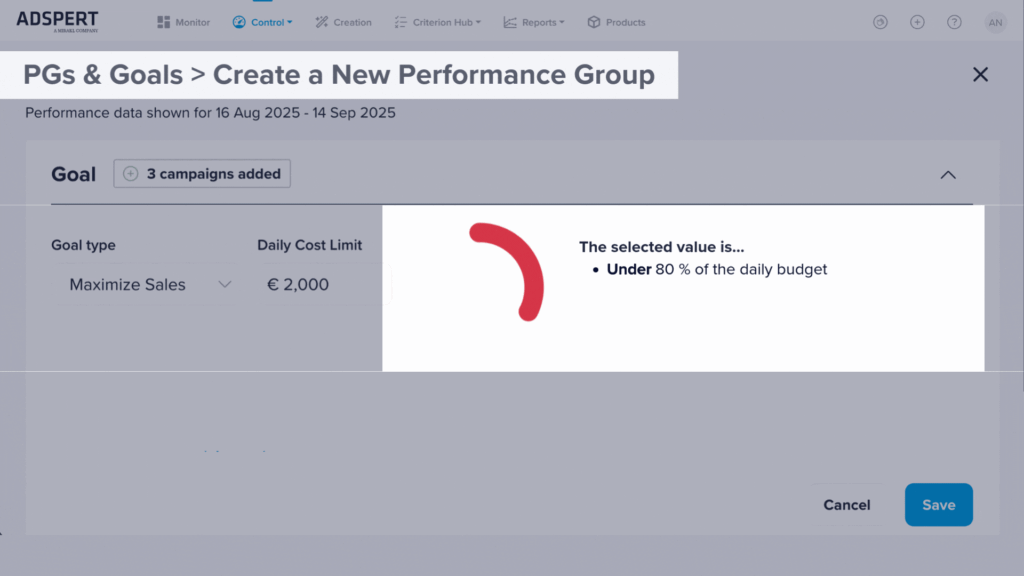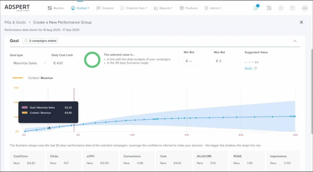 This goal is the default for all new Performance Groups because it gives both you and Adspert’s AI the best possible starting point for optimization, especially in the beginning.